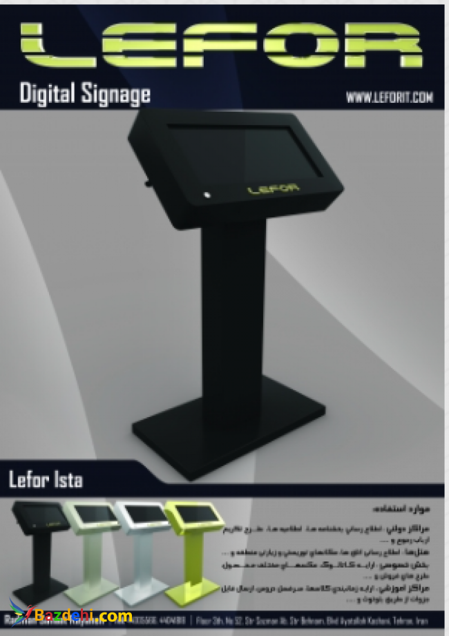 مشخات فنی محصول : Kiosk Body: iron 1.5mm tickness Display: X-vsion 24 Touch: IR MAINBOARD : Intel chipset Industrial series CPU : intel dual/quad core fanless series RAM : 2/4 GB DDRIII Storage: ssd 32/64GB, hdd/320 POWERT : DC board+12v 5A موارد استفاده از کیوسک های اطلاع رسانی: مراکز دولتی : اطلاع رسانی بخش نامه ها – اطلاعیه ها – طرح تکریم ارباب رجوع – رزرو غذا پرسنل و کارمندان – نمایش و ثبت ورود و خروج پرسنل و کارمندان – چاپ فیش حقوقی و… هتل ها : اطلاع رسانی اتاق ها – مکان های توریستی و زیارتی ¬– رزرو بیلیت های مراکز تفریحی بخش خصوصی : ارائه کاتالوگ – عکس های مختلف محصول – طرح های فروش – رزرو بیلیت – نمایش نرم افزار ها و کار های گرافیکی – ارسال نرم افزار از طریق بلوتوث بیمارستان ها و مراکز درمانی: نمایش حضور دکتر در درمانگاه ها – نوبت دهی تخصصی بیمارستان ها – راهنمای طبقات و اتاق ها – نمایش صف و تراکم جمعیت در آزمایشگاه ها و داروخانه ها – نمایش نوبت ارباب رجوع – نمایش عکس رایدیو لوژی روی کیوسک به جای نگاتیو دانشگاه ها و مراکز آموزشی : ارائه زمانبندی کلاس ها – سرفصل دروس – ارسال فایل و جزوات از طریق بلوتوث – کتابخانه ها – رزرو غذا در طول هفته یا ماه مدل های مشابه در https://leforit.com 44005566