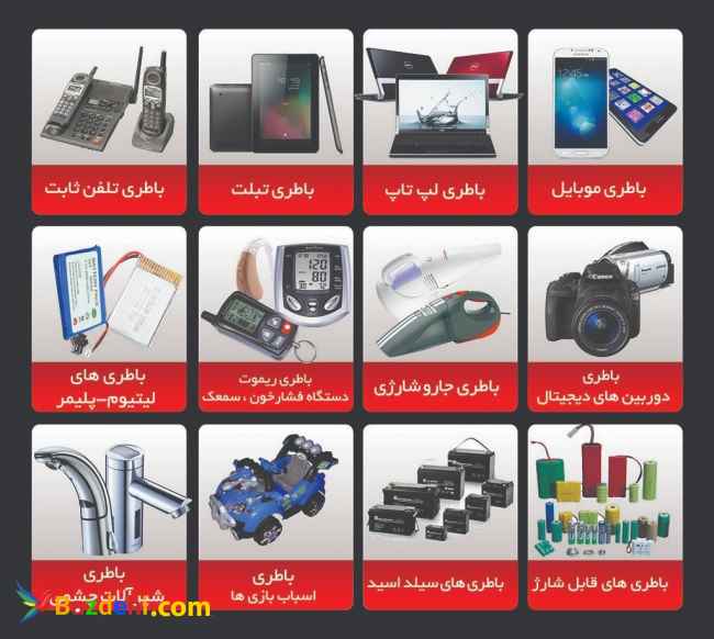 بيش از 3000مدل باطري مجموعه کامل از: باطري موبايل باطري تبلت باطري لپتاپ باطري آلکالاين باطري قلمي باطري نيم قلمي باطري دوربين باطري سمعک باطري ريموت باطري کنترل باطري فشارسنج باطري ليتيوم پليمير باطري کواد کوپتر باطري سافت باطري سکه اي باطري ساعت باطري شير آلات چشمي باطري کتابي باطري متوسط باطري بزرگ باطري سيلداسيد باطري خشک باطري قابل شارژ باطري موتور باطري قلاده باطري نيکل کادميوم باطري نيکل متال باطري ups باطري دريل شارژي باطري جارو شارژي و غيره بانک باطري BankBattery.co تلفن: 02191093035