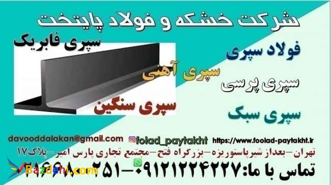 . شرکت خشکه و فولاد پایتخت (( مدیریت : جواد دلاکان )) صنعتگران عزیز، افتخار داریم که سالها تجربه گرانبهای خویش را در زمینه عرضه انواع ورق آلیاژی و انواع فولاد آلیاژی برای خدمت رسانی به شما هموطنان کشور عزیزمان ایران ارائه می دهیم. پیشاپیش از اینکه شرکت خشکه و فولاد پایتخت را جهت خرید خود انتخاب می نمایید سپاسگزاریم. ارتباط با ما: ۰۹۱۲۱۲۲۴۲۲۷ ۰۹۳۷۱۹۰۱۸۰۷ تلفن: ۰۲۱۶۶۸۰۰۲۵۱ فکس: ۶۶۸۰۰۵۴۶ یکی از فرآورده های پر کاربرد در صنعت و ساختمان سازی سپری است .سپری به دو صورت فابریک و پرسی تولید می شود. البته گاهی اوقات تیرآهن را از طول بریده و به دو قسمت مساوی تقسیم می کنند. که به این صورت هم سپری تولید می گردد.سپری ها با توجه به روش تولید و از نظر ظاهری با دو روش تولید می گردند. ۱- نورد گرم ۲- نورد سرد. سپری ها از نطر مواد بهکار رفته شامل: سپر آهنی ، سپر آلومینیومی، سپر مسی، سپر برنجی و سپر استیل می باشند. از سپری های موجود در بازار برای ساختن انواع مختلف اتصالات پل ها به ستون ها، درب و پنجره. ساخت سازه های فلزی، ستون ها و خرپا ها. اسکلت گلخانه ها، سقف شیشه ای و موارد د یگر به کار می رود..