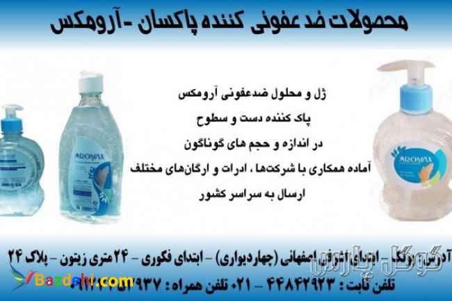 محصولات ضد عفونی کننده پاکسان - آرومکس (آنتی کرونا) توجه توجه مجموعه اپل لند در راستای حفظ سلامت همراهان گرامي خود، اقدام به تهيه و فروش مواد ضد عفونی نموده است تا با خیال راحت در امان بمانید✌️ پاک کننده دست و سطوح حاوی اتانول ۷۰٪ و از بین برنده کرونا‌ویروس حاوی گلسیرین جلوگیری از خشکی پوست ضد حساسیت و ضد قارچ، دارای آنتی باکتریال استفاده آسان بدون نیاز به ابکشی درصد الکل 72 % ⚫️در اندازه و حجم های گوناگون همه‌ و همه در ژل و محلول ضدعفونی آرومکس ♻️تضمین سلامتی و مقابله با کرونا با مواد ضدعفونی کننده شرکت پاکسان ✔️ آماده همکاری با شرکت‌ها ؛ ادرات و ارگان‌های مختلف ارسال به سراسر کشور جهت سفارش : 02144842923 09123353937 ارسال از طریق پست با حجم کم یا باربری