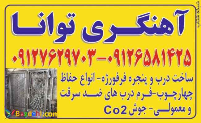 با سلام . *کارگاه آهنگری توانا با سابقه فراوان و کادری مجرب آماده قبول و ساخت انواع درب و پنجره های آهنی طبق سلیقه مشتریان گرامی میباشد . *ساخت انواع درب و پنجره های ساده و فرفورژه ، انواع چهار چوب فرانسوی و مکزیکی ، انواع حفاظ رو دیواری ، پشت پنجره ای و ... ، انواع شاخ گوزنی در تراکم و سایز مختلف ، انواع فرم درب و پنجره ، انواع درب های آکاردئونی ، لوله کشی گاز ، اجرای اسکلت فلزی و... . شماره تماس : 09127629703_ 09126581425 *آماده همکاری با کارگاه های صنعتی ، پیمانکاران و ساختمان سازان و ... هستیم. انواع حفاظ پنجره فرفورژه تراکم حفاظ شاخ گوزنی حفاظ پنجره از داخل حفاظ پنجره دوجداره درب آکاردئونی درب آکاردئونی درب فرفورژه باغ درب فرفورژه پارکینگ درب فرفورژه تک لنگه درب فرفورژه جدید درب فرفورژه ویلایی قیمت پنجره آهنی نصب حفاظ شاخ گوزنی