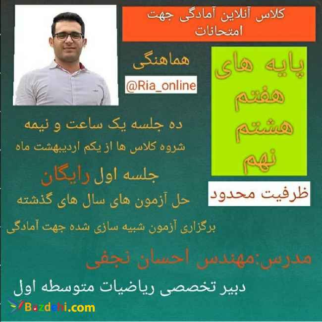 ثبت نام شروع شد کلاس های آمادگی جهت امتحان پایه های هفتم هشتم و نهم ظرفیت محدود کلاس ها به صورت وبینار و در بستر اسکای روم برگزار می شود پس نیاز به نصب هیج برنامه و یا کاری نیست. رفع اشکال و ارتباط با مدرس بعد از کلاس ده جلسه یک ساعت و نیمه تا زمان امتحانات فقط و فقط با ۲۰۰ هزار تومن جلسه اول رایگان جهت رزو با آیدی موجود در عکس و یا شماره تلفن 09039544658 هماهنگ کنید
