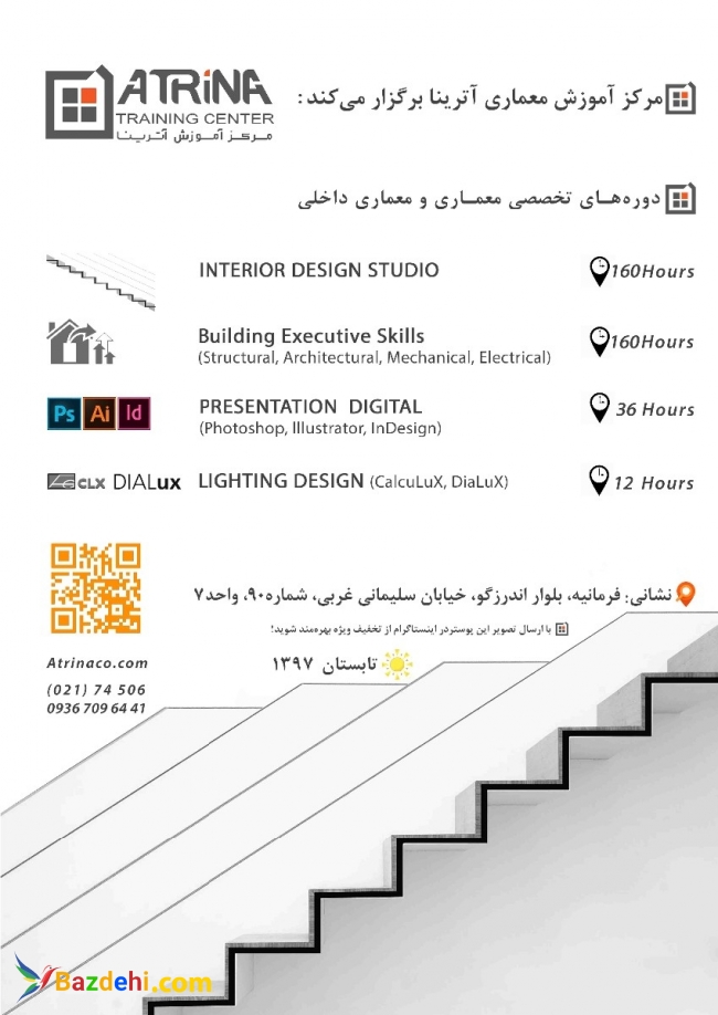 آموزش- معماری- معماری داخلی- طراحی، نظارت و اجرا- نرم افزار- تری دی مکس- راینو- گرس هاپر- آردینو- پرزانته دیجیتال- پست پروداکشن- عکاسی- هترودیونو