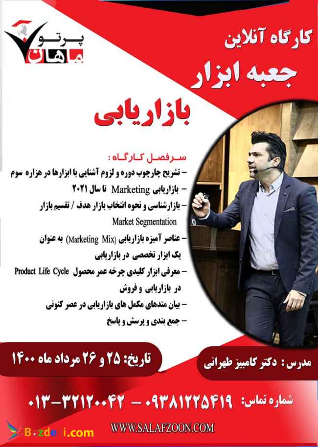 شروع ثبت نام کارگاه آنلاین دو روزه جعبه ابزار بازاریابی مباحث و سرفصل ها: تشریح چارچوب دوره و لزوم آشنایی با ابزارها در هزاره سوم - بازاریابی Marketing تا سال 2021 - بازارشناسی و نحوه انتخاب بازار هدف / تقسیم بازار Market Segmentation - عناصر آمیزه بازاریابی (Marketing Mix) به عنوان یک ابزار تخصصی در بازاریابی - معرفی ابزار کلیدی چرخه عمر محصول Product Life Cycle در بازاریابی و فروش - بیان متدهای مکمل های بازاریابی در عصر کنونی - جمع بندی و پرسش و پاسخ مدرس: دکتر کامبیز طهرانی (مدرس مدرسه عالی کاسب ماهان) تاریخ دوره: 25 و 26 مرداد ماه 1400 شماره تماس مشاوره و ثبت نام: 01332120042 09381225419