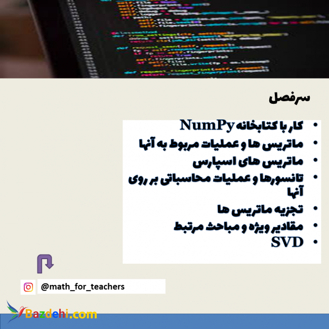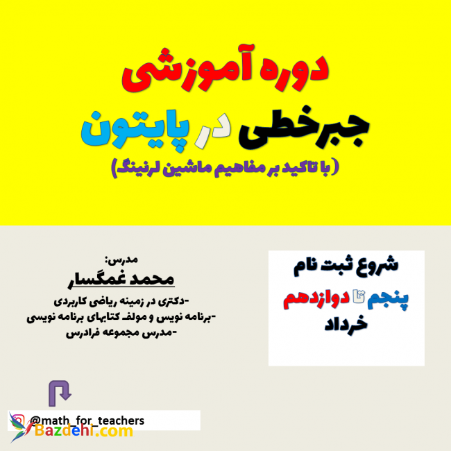 جبر خطی در پایتون +هدف دوره تاکید بر مفاهیم، ماشین لرنینگ و ورود به بازار کار این رشته +شش ساعت اموزش مجازی با مثال های عملی +پیش نیاز دوره اشنایی اولیه با مفاهیم جبرخطی +دوره پیش نیاز سنی و تحصیلی ندارد +کسب اطلاعات بیشتر و ارتباط با مدرس در اینستاگرام: math_for_teachers@