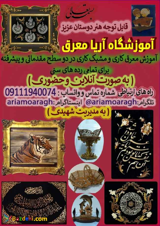 آموزشگاه آریا معرق با آموزش معرق کاری و مشبک کاری در دو سطح مقدماتی و پیشرفته هم به صورت حضوری و هم آنلاین در خدمت شما عزیزان می باشد در دوره مقدماتی آشنایی با تاریخچه معرق کاری ، ابزار برقی و دستی، چوب ها و روش صحیح برش کاری که مهمترین قسمت از این هنر میباشد آموزش داده می شود طریقه ساخت یک تابلو از صفر تا صد به هنرجو آموزش داده می شود که در طول دوره یک نمونه کار مشبک و در پایان دوره یک تابلو توسط هنرجو ساخته میشود در طول دوره مقدماتی آموزش عملی سیلر کاری و کیلر کاری یک تابلو معرق به هنر جو آموزش داده می شود در دوره پیشرفته طریقه ساخت انواع تابلوهای خطی، تفکیک رنگ ،مینیاتور و.... به هنرجویان آموزش داده می شود ،طریقه رنگ ریزی کارهای زمینه رنگ و در نهایت طریقه درست کردن و استفاده از نیم پلی استر و تمام پلی استر که یکی از مباحث مهم این هنر میباشد به هنر جویان آموزش داده می شود هر دوره حدودا دو ماه طول می کشد و بین ده تا دوازده جلسه بسته به پیشرفت هنر جو ها می باشد. در پایان هر دوره نیز به طور کامل رفع ایرادات هنر جویان انجام می شود و ارتباط بین هنر جویان و آموزشگاه همچنان ادامه خواهد داشت و بعد از هر دوره کلاس های حضوری و آنلاین بهترین هنرجویان همکاری خود با آموزشگاه راشروع خواهند کرد با تشکر شهیدی