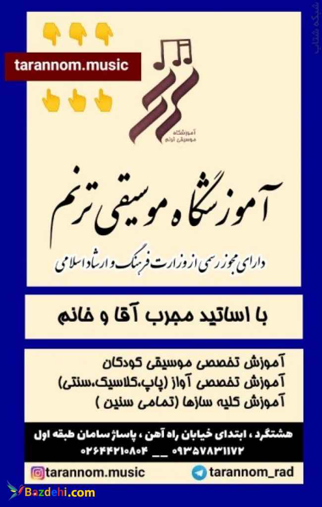 هشتگرد ، ابتدای خیابان راه آهن ، پاساژ سامان ، طبقه اول ، آموزشگاه موسیقی ترنم