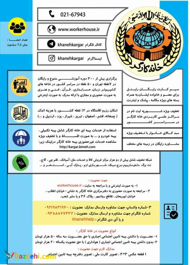 آموزش رایگان دوره های آموزشی به صورت کوتاه مدت یکماهه و در رشته های کامپیوتر، زبان، حسابداری، هنری و فنی در قالب بیش از 500 دوره متنوع به صورت مجازی و حضوری در سراسر کشور، به همراه خدمات متنوع مهمان سرا با تخفیف ویژه، خدمات بیمه ای ، خدمات تعاونی و ....... با عضویت اینترنتی از طریق سایت خانه کارگر: http://workerhouse.ir/members/default.aspx?R=82102100350107 با ارسال رایگان کارت عضویت 3 ساله درب منزل لیست دوره های آموزشی: amoozeshemajazi.ir در صورتی که سوالی دارید به شماره نمایش داده شده کلمه عضویت را واتساپ یا پیامک کنید تا با شما تماس گرفته شود