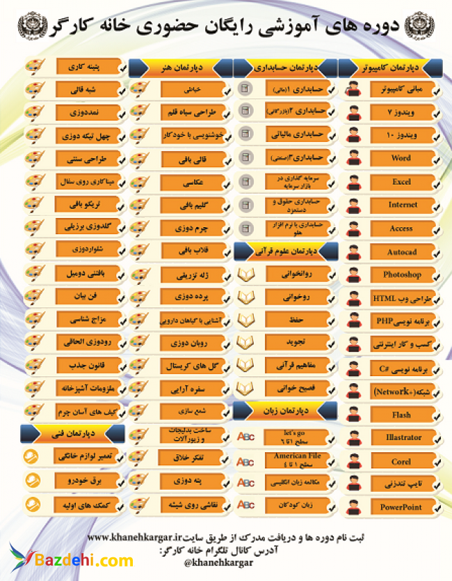 آموزش رایگان حضوری و مجازی هنری، زبان، کامپیوتر ، حسابداری و فنی