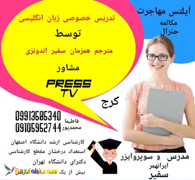 زبان انگلیسی را در کرج به صورت خصوصی و توسط مترجم همزمان سفیر اندونزی، مشاور برنامه پرس تی وی آموزش ببینید و به راحتی برای مهاجرت، آیلتس و تسلط کامل به مکالمه و دوره های جنرال آمادگی پیدا کنید تجربه ثابت کرده است که زبان انگلیسی را از فارغ التحصیل این رشته فرا گیرید که از افتخارات ما رتبه برتر و استعداد درخشان بودن دانشگاه اصفهان در مقطع کارشناسی ارشد و دکترای دانشگاه تهران میباشد و با تجربه بیش از یک دهه تدریس در آموزشگاه های معتبر ایرانمهر، ایران کانادا، سفیر و... به شما برای رسیدن به هدف کمک میکنیم و به عنوان مدرس زبان انگلیسی در گوگل نیز برند هستیم هزینه هر جلسه خصوصی آیلتس صد و بیست هزار تومان ( دو نفره شامل تخفیف ) هزینه هر جلسه خصوصی جنرال ( شصت تا هفتاد هزار تومان ) هزینه هر جلسه خصوصی مکالمه ( هفتاد هزار تومان ) شماره تماس و تعیین سطح رایگان 09919580755 09105952744 کرج