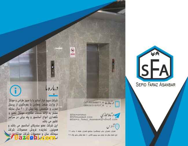 طراحی، فروش ، نصب و سرویس و نگهداری انواع آسانسور طراحی،فروش،نصب و راه اندازی،سرویس و نگهداری انواع پله برقی اجرای طرح های بازسازی آسانسور فروش قطعات اخذ گواهی استاندارد مشاوره و بازدید رایگان توسط کارشناسان مجرب با مدیریت علی رنجبر تماس از ساعت 8.30 الی 17.00 ( گروه فنی مهندسی سپید فراز آسانبر )