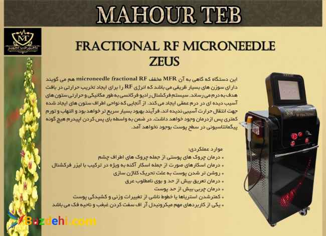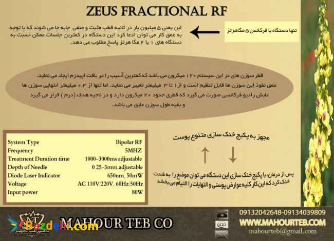 دستگاه آر اف فرکشنال میکرونیدلینگ زئوس جدیدترین دستگاه آر اف فرکشنال مجهز به پکیج خنک سازی متنوع برای جوانسازی و کلاژن سازی پوست با بالاترین جوابدهی کاربردهای دستگاه آر اف فرکشنال ZEUS » درمان چروک های پوستی از جمله چروک های اطراف چشم » درمان چروک و خطوط ریز پوستی » درمان اسکارهای صورت از جمله اسکار آکنه به ویژه در ترکیب با لیزر فرکشنال » درمان اسکار جوش، جراحی و سوختگی » روشن تر شدن پوست به علت تحریک کلاژن سازی » جوانسازی پوست » درمان تعریق بیش از حد و بوی نامطلوب عرق » درمان چربی بیش از حد پوست » کمترشدن و درمان استریاها یا خطوط ناشی از تغییرات وزنی و کشیدگی پوست » کوچک کردن منافذ باز پوستی » درمان خطوط اطراف لب در افراد سیگاری » سفت کردن غبغب و ناحیه (یکی از کاربردهای مهم میکرونیدل آر اف فرکشنال زئوس) بهترین ها را از ما بخواهید "ماهور طب" مشاوره تخصصی و تجهیز مطب و کلینیک مهندس اله وردی 09134037816