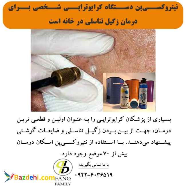 با استفاده از نیتروکسیپن کرایوتراپی را بصورت شخصی و در خانه انجام دهید. روش استفاده از نیتروکسیپن 1- ابتدا باید ناحیه مورد درمان و اطراف آن کاملا تمیز کنید. 2- در دومین قدم تمامی ضایعات گوشتی و برجسته را شناسائی کنید و علامت بگذارید (مثلا با ماژیک وایت برد) 3- ناحیه مورد نظر را با ژل ضد یخ، پوشش دهید. 4- قالب مناسبی برای کرایوتراپی این موضع انتخاب کنید. 5- اسپری را از فاصله بسیار نزدیک بپاشید. 6- حدود سه ثانیه اسپری کنید. 7-متناسب با میزان برجستگی ضایعه پوستی، مدت زمان اسپری کردن را طولانی تر بکنید. 8- اطمینان حاصل کنید که زگیل یا ضایعه به اندازۀ کافی فریز شده باشد. (سرما به ریشه رسیده) 9-نیاز خاصی به پانسمان، مراقبت های بعد از درمان و ... نیست. 10- بعد از چند روز زگیل، گوشت اضافه، خال یا هرچیزی که کرایوتراپی شده بود می افتد. محتویات محصول: این محصول شامل یک کپسول 200 میلی لیتری نیتروژن مایع با توان سرمادهی منفی 70 درجه سانتی گراد به همراه نازل مخصوص و ظرف 200 میلی لیتری حاوی ژل محلول ضد عفونی کننده و ضدیخ برای استفاده در اطراف موضع هدف میباشد. تاریخ انقضا: 3سال موجود در انبار شرکت - تحویل در کوتاهترین زمان قیمت: 2000000 تومان امکان ارسال فایل ویدیویی روش استفاده به راحتی در منزل بدون درد و خون ریزی زگیل تناسلی خود را درمان کنید. شماره تماس: 6519-603-0922