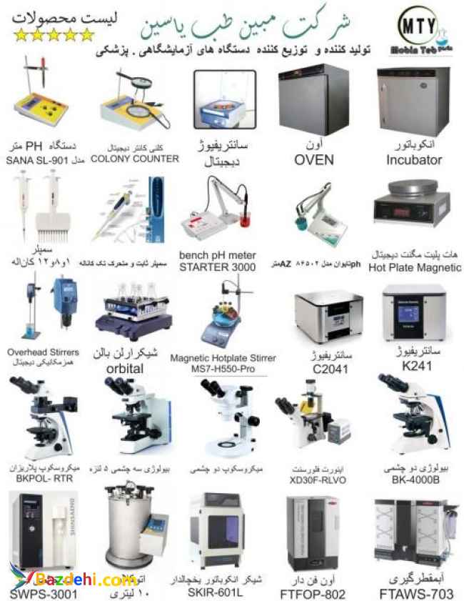 شرکت مبین طب یاسین_ . با هدف فعالیت در زمینه طراحی تولید و توریع دستگاه های .ازمایشگاهی- پزشکی مواد شیمیایی و شیشه آلات . با مسئولیت محدود درخدمت جامعه .علمی -آزمایشگاهی کشور می باشد شایان ذکر است تولیدات این شرکت با سیستم تمام .دیجیتال .طرحی نو زیبا و کاملا اختصاصی با بهره گیری از فن آوری و دانش روز دنیا و .توان و نخصص مهندسین ایرانی با کیفیت برتر تولید گردیده و دارای ضمانت و خدمات پس از فروش می باشد .لیست تولیدات داخلی شرکت مبین طب یاسین : .هود شیمیایی و هود لامینار فلو - فور(آون) - انکوباتور - هات پلیت مگنت دیجیتال ( .هیتراستیرر) - بن ماری جوش و سرولوژی دیجینال - دستگاه آب مقطرگیری .کوره ازمایشگاهی - سانتر یفوژ - PH متر رومیزی دیجیتال- کلنی کانتر دیجیتال و غیره ..... * اجرای پروژه های سکوبندی, ساخت و نصب میزهای ازمایشگاهی , میز توزین , . .میزهای شستشوی ازمایشگاهی , پارتیشن بندی ,کابینت و کمدهای نگهداری مواد و .تجهیزات آزمایشگاهی ,با استفاده از مرغوبترین ملزومات(از جنس MDF .استیل 304 نگیر و استیل 316 ضد اسید با ارائه طرح های کاملا جدید ونوآورانه از جمله .محصولات و خدمات این شرکت می باشد . .سایر تجهیزات و دستگاه های موجود: - دستگاه ها از کمپانی IKA آلمان - MEMMERT آلمان - Fineteck کره - Dragon چین شامل انواع : شیکرارلن بالن روتاری اواپراتور- سمپلر .های ثابت ومتغیر .اورجینال - هات پلید مگنت -مگنت استیر- هموژنایزر- بن ماری جوش وسرلوژی - .میکسر همزن لوله - فریز 86- درجه آزمایشگاهی و غیره ... .انواع میکروسکوپ و لوپ از کمپانی NIKON ژاپن Olympus و jenus و Novel و سایر .کمپانی ها و غیره ..... .شیکر الک - جارتست ph متر دیجیتال -Ec متر- مولتی متر - کنداکتیویمتر - Dataloger .آب خالص ساز - دیونایزر - اسپکتورفتومتر -بورت اتوماتیک - پمپ خلاء و ... از کمپانی های معتبر ایرانی و خارجی . .انواع مواد شیمیایی- و محیط کشت ها انواع ظروف شیشه ای و پلاستیکی و مواد مصرفی از قبیل سرسمپلر های فیلتردار استریل میکروتوپ - فالکون 15 میلی و 50 میلی - پلیت کشت سلولی و غیره .... . . . (((با ما در تماس باشید ))) بهترین کیفیت بازار را از ما خریداری کنید :)