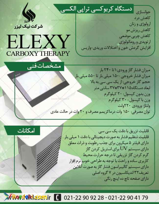 امکانات دستگاه کربوکسی الکسی : • قابلیت تزریق با دقت یک سی سی • قابلیت تنظیم فشار به صورت دیجیتالی با دقت ۱ میلی بار • دارای فیلتر ۵ میکرون برای جذب رطوبت و ذرات معلق • دارای سیستم UV برای استریل کردن گاز • گرم کردن گاز تزریقی تا درجه حرارت محیط • کاربری ساده و راحت با توجه به طراحی خوب نرم افزار • دارای سیستم کالیبراسون فشار گاز به صورت آنلاین • تعریف۳۲ اندیکاسیون در ۷ گروه اصلی • دارای صفحه تاچ 10 اینچ رنگی مشخصات : • دارای صفحه تاچ 10 اینچ رنگی • میزان فشار خروجی :۱۵۰ میلی بار تا ۵۵۰ میلی بار • حجم گاز خروجی: از یک سی سی به بالا • ابعاد دستگاه:۱۱۵*۳۷*۳۷ سانتی متر • وزن بدون کپسول: ۲۰ کیلوگرم • وزن با کپسول : ۳۰ کیلوگرم • ولتاژ: ورودی ۲۲۰ولت • توان مصرفی: ۱۵۰ وات درماکزیمم مصرف و ۲۰ وات در حالت عادی مزایای استفاده از دستگاه کربوکسی الکسی : • جوانسازی • کاهش درد ارولوژی و زنان • کاهش ریزش مو • کاهش چربی موضعی • ارتوپدی و روماتولوژی • افزایش گردش خون و اختلالات وریدی-واریس جهت کسب اطلاعات بیشتر با کارشناسان نیک لیزر تماس حاصل فرمایید. • ☎️ 02122004102 • ☎️ 02122004103 • ☎️ 09129640360 • کانال تلگرام: 1t.me/niklaser • وب سایت: www.Niklaser.com • وب سایت: www.Niklaser.ir • اینستاگرام: Niklaser_com