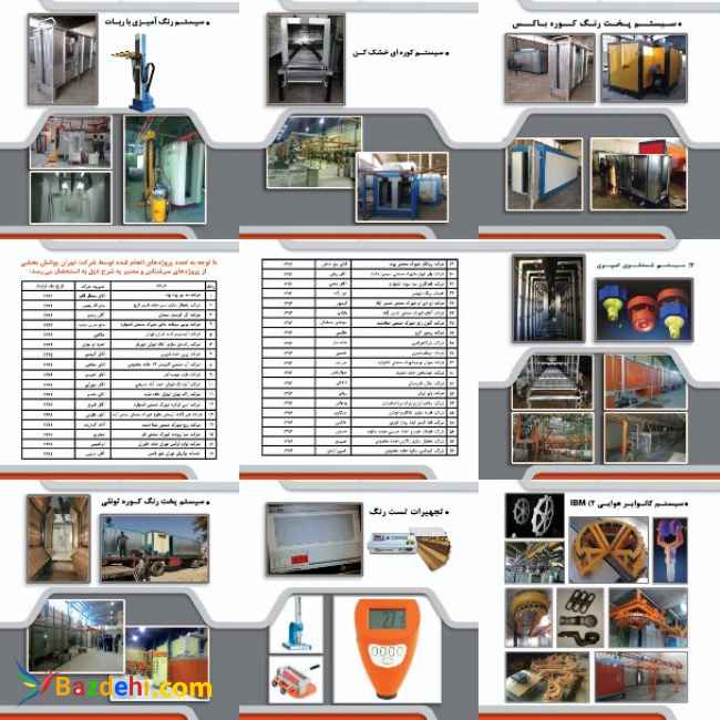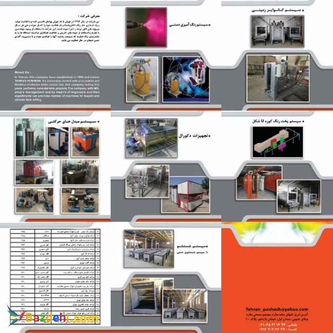 سازنده خط رنگ الکترواستاتیک شرکت تهران پوشش ارائه خدمات رنگ پودری و رنگ الکترواستاتیک سازنده انواع کوره رنگ و کانوایر خدمات شرکت تهران پوشش ✅ ساخت انواع کوره ✅ ساخت انواع کانوایر در سایز های مختلف ✅ ساخت انواع سیستم های خشک کن ✅ ساخت انواع ربات رنگ پاش ✅ فروش رنگ پودری ✅ ساخت دستگاه دکورال (طرح چوب) ✅ ساخت انواع کابین رنگ مایع و پودری بصورت حرکت خطی ✅ طراحی ساخت نصب و راه اندازی خط رنگ الکترو استاتیک ✅ خرید و فروش کوره ، کانوایر ، سایکلون و دستگاه پاشش نو و کارکرده ✅ انجام خدمات رنگ آمیزی کلیه قطعات فلزی به طریقه الکترو استاتیک ✅ مشاوره رایگان در زمینه کلیه سیستمهای رنگ الکترو استاتیک خدمات رنگ پودری کوره ای رنگ پودری کوره ای که پس از رنگ مایع به بازار آمده از رزین نفت بدست می آید ، این مدل رنگ که بصورت پودر میکرونیزه تولید میشود ، ذرات آن بصورت ۶۰ میکرونی بوده و پس از اعمال برروی قطعه کار و قرارگرفتن در محیط کوره با دمای ۲۰۰درجه ذوب شده و تبدیل به یک لایه رنگ با ضخامت حدود ۵۰ تا ۱۰۰ میکرون و با ظاهری زیبا و استقامت فیزیکی بسیار بالا ، قطعات فلزی را پوشش داده و مورد مصرف صنعتی دارد. سازنده کوره 6 متری کوره ها در ابعاد مختلف طراحی و ساخته میشوند. در برخی از موارد مشتری جهت رنگ آمیزی پرفیل کامل نیاز به کوره ۶متری دارد که به سفارش مشتری عرض و ارتفاع آن قابل تغییر میباشد ولی طول کوره ۶متر در نظر گرفته میشود. تولید و فروش دستگاه ربات رنگپاش ربات رنگپاش جایگزین خوبی برای اپراتور میباشد که هم از لحاظ سرعت و هم از لحاظ کیفیت رنگپاشی بهتر از اپراتور انجام میگیرد. محاسن ربات نسبت به سیستم دستی ۱سرعت زیاد ۲ کیفیت خوب ۳ نیاز به استراحت ندارد و یکنواخت بودن سطح قطعه رنگ شده میباشد موبایل : 09123026639 مهندس شجاع تلفن کارگاه: 02165415630 تلفکس دفتر: 02165415634
