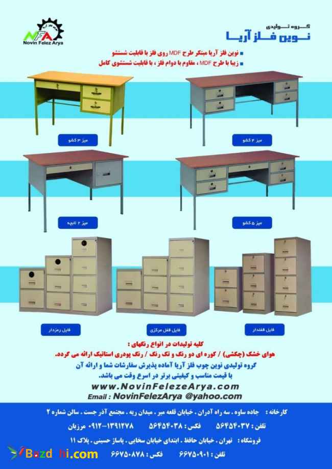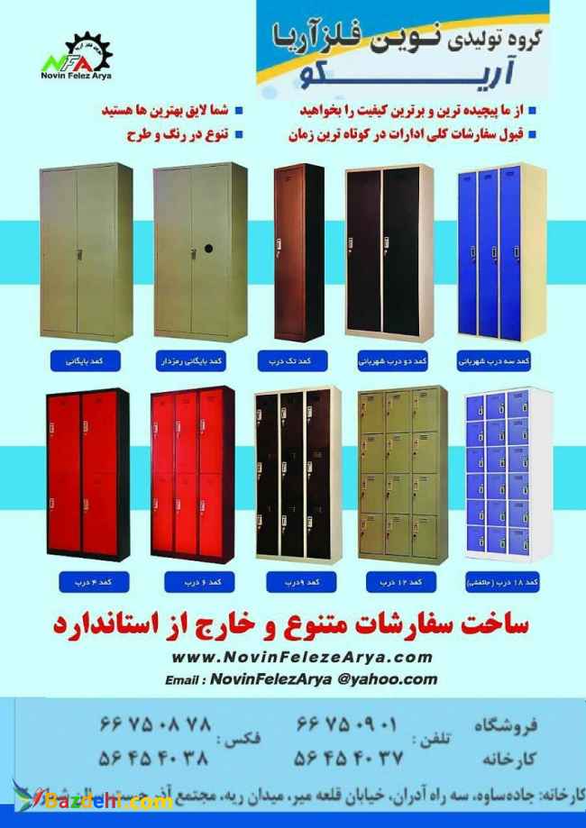 گروه تولیدی نوین فلز آریا با هدف حذف واسطه گری اقدام به فروش مستقیم محصولات خود (انواع کمد ، فایل ، میز ، جاکفشی ، جعبه کمک های اولیه و ...) با قیمت بسیار مناسب کرده است و همراه با استقرار سیستم کنترل کیفیت ما را به عنوان یک برند ایده آل معرفی نموده . توان ظرفیتی بالای تولیدات ساخت سفارشات متنوع و خارج از استاندارد ما را قادر به پاسخگویی به حسن اعتماد مشتریان ساخته و اکنون با افتخار نائل به تحقق شعار خود (( کیفیت برتر ، قیمت مناسب)) گردیده ایم. حضور هرساله در نمایشگاه های بین المللی ، 6 ماه گارانتی محصولات ، تهیه ی ورق درجه یک از شرکت فولاد مبارکه اصفهان . سابقه همکاری در تولیدات انبوه با مترو ، دانشگاه امام حسین ، نیروهای مسلح ، وزارت دفاع ، کارخانجات کاله ، میهن ، فولاد غرب و... ساخت تمام محصولات طبق ابعاد و رنگ مورد درخواست و .. از ویژگی های برتر ماست. بخشی از تولیدات ما عبارتند از: کمد بایگانی معمولی ، رمزدار انواع کمدهای فلزی کارگری و نظامی و رختکن و اداری از تک درب الی 30 درب انواع فایل بازرگانی 2 الی 5 کشو ، قفل دار ، قفل مرکزی و قفل رمزدار انواع جاموبایلی تک درب الی 100 درب به سفارش مشتری انواع میز فلزی ، معلم ، تک کشو 2/3/4/5 کشو با صفحه MDF ساخت فایل بایگانی دوار بشقابی و پوشه آویز و ترکیبی جاکفشی مناسب نمازخانه و اماکن متبرکه انواع صندوق انتقادات و پیشنهادات ، صندوق پستی ، جاکلیدی ، کمک های اولیه