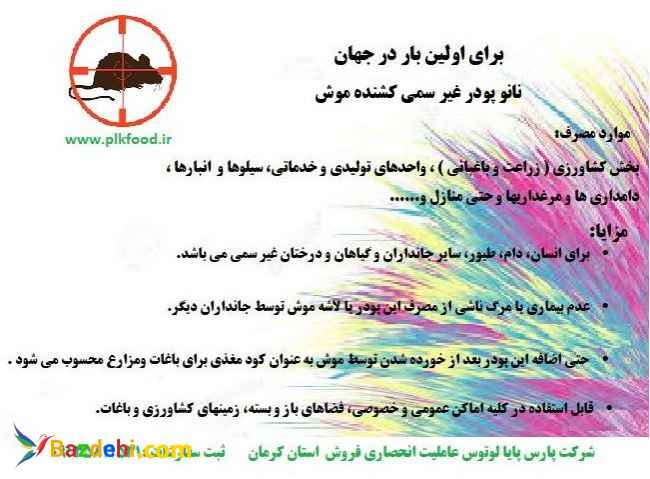 برای اولین بار در جهان نانو پودر غیر سمی کشنده موش( همراه با کلیه مجوزهای لازم ) در ایران موارد مصرف: بخش کشاورزی ( زراعت و باغبانی ) ، واحدهای تولیدی و خدماتی، سیلوها و انبارها ، دامداری ها و مرغداریها، حتی منازل و ...... مزایای استفاده : 1- فقط کشندگی برای موشها دارد. 2- برای انسان، دام، طیور، سایر جانداران و گیاهان و درختان غیر سمی می باشد. 3- عدم بیماری یا مرگ ناشی از مصرف این پودر یا لاشه موش توسط جانداران دیگر. 4- حتی اضافه این پودر بعد از خورده شدن توسط موش به عنوان کود مغذی برای باغات ومزارع محسوب می شود . 5- قابل استفاده در کلیه اماکن عمومی و خصوصی، فضاهای باز و بسته، زمینهای کشاورزی و باغات. 6- عدم مشاهده لاشه موشها به دلیل مرگ موش در لانه و محل امن . 7- عدم بوی بد لاشه بعد از مرگ موش. 8- ماندگاری طولانی محصول اگر بطور مستقیم در معرض رطوبت و اب قرار نگیرد. 9- عدم آلودگی محیط زیست و آبهای زیر زمینی. 10- مقرون به صرفه اقتصادی . انواع بسته بندی : 1- بسته بندی یک کیلویی شامل 20 بسته پنجاه گرمی 2- بسته بندی 100 گرمی شامل 2 بسته پنجاه گرمی شرکت پارس پایا لوتوس عاملیت انحصاری فروش استان کرمان ثبت سفارشات :09135811531 www.plkfood.ir