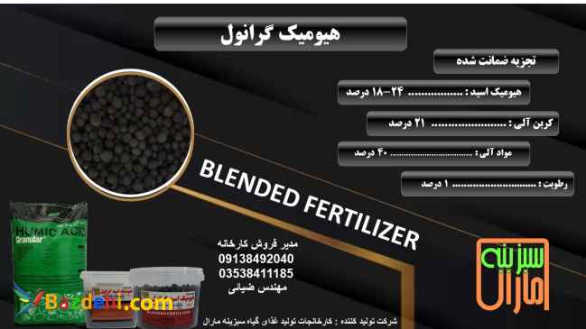 مزایای کود هیومیک اسید گرانول 1- ساختار خاک را بهبود می بخشد. 2- به ریشه زایی کمک می کند. 3- باعث نگهداری بیشتر آب در خاک می شود. 4- به رشد سریع باکتری های مفید در خاک کمک میکند. 5- به انحلال و آزادسازی عناصر میکرو و ماکرو کمک کرده و در نتیجه نیاز به کودهای شیمیایی را به نحو محسوسی کاهش می دهد. 6- مقاومت به شوری ، کم آبی و سرما را افزایش می دهد. 7- از سمیت کودها و عناصر موجود در خاک می کاهد. 8- دوام آن زیاد است و تا چند سال اثر آن در خاک باقی می ماند. 9- مقاومت گیاه را در مقابل انواع بیماری ها افزایش داده و نیاز به مصرف سموم را به نحو محسوسی کاهش می دهد. 10- سرعت جوانه زنی بذر را افزایش می دهد. 11- با طبیعت سازگار است و خطری برای گیاه و محیط زیست ندارد . 12- هیومیک اسید بهترین عامل طبیعی کلات کننده عناصر فلزی خاک می باشد کارخانجات سبزینه مارال یزد تولید انواع کودهای کشاورزی مشاوره رایگان ارسال به کل کشور با مجوز محصولات از موسسه آب و خاک کشور انواع کود مناسب زمان کشت .مکان کشت و نوع کشت نقد و اقساط فروش از درب کارخانه ?مدیر فروش 09138492040