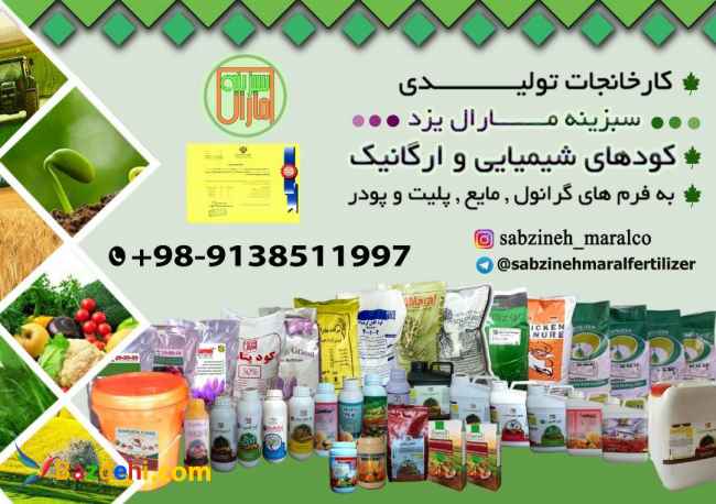 ۰۹۱۳۸۵۱۱۹۹۷ فروش مستقیم از درب کارخانه کارخانجات سبزینه مارال یزد?تولیدکننده کودشیمیائی?ارگانیک(آلی)?ومعدنی?به فرم گرانول✔مایع✔پودری✔پلیت✔ بامجوز محصولات✅ تاییدیه وزارت جهاد کشاورزی✅پروانه بهره برداری به شماره ۵۲۵۵ از مجوزوزارت صنعت،معدن وتجارت✅آزمایشگاه آب و خاک(کنترل کیفیت )-معدن اختصاصی لئوناردیت لیست دیگر محصولات ۲۰_۲۰_۲۰ ۱۲_۱۲_۳۶ ۱۵_۵_۳۰ ۱۰_۵۲_۱۰ پودری سولفات آهن سولفات پتاسیم نیترات کلسیم فسفر و پتاس پودری هیومیک اسید و فولویک ۹۵ درصد محلول پودری میکرو مکس پودری گوگرد معدنی پودری گیاهان آپارتمانی پودری روی و بور و ازت گرانول هیومیک اسید و فولویک (اگری مارال) گرانول کود کامل ۲_۱_۲ گرانول گوگرد معدنی گرانول کود کامل ۷_۳_۷ مایع هیومیک و فولویک اسید با غلظت چند برابر مایع مرغی +هیومیک اسید مایع جلبک دریائی مایع کلسیم_ات پلیت مرغی دستور مصرف زمان مصرف