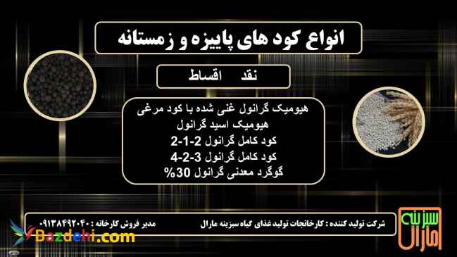 کارخانجات #سبزینه_مارال تولید کننده انواع #کودهای شیمیایی و ارگانیک به فرم های #گرانول #پودری #مایع با بیش از بیست سال سابقه در زمینه تولید کودهای #کشاورزی تمامی محصولات دارای تاییدیه آب و خاک کشور انواع کودهای گرانوله مخصوص فصل پاییز و زمستان و #چالکود ارسال به سراسر کشور فروش به صورت خرده و عمده به صورت نقد و اقساط مدیر فروش کارخانه 09138492040
