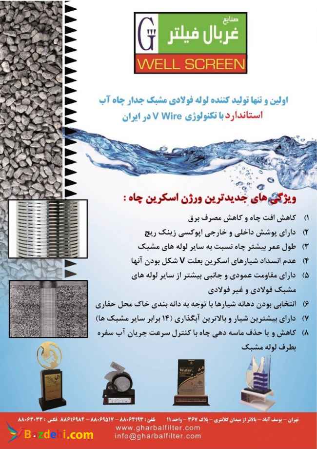 شرکت صنایع غربال فیلتر اولین و تنها تولید کننده لوله مشبک صنعتی استاندارد جدار چاه آب نسل چهارم طرح جانسون امریکا منطبق با آخرین تکنولوژی و دانش روز دنیا در ایران با نام ثبت شده غربال می باشد. محصولات این شرکت دارای مزایای زیر می باشد: