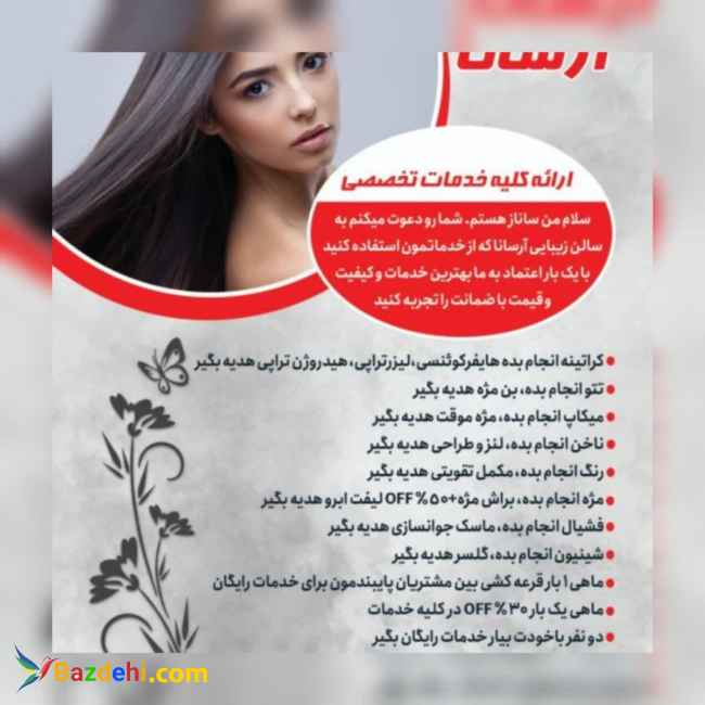 سالن زیبایی آرسانا یکی از بهترین سالن های شرق تهران واقع در براصلی پیروزی بین کوچه شاه آبادی و دریاباری بالای طباخی کاج پ716ط3واحد8 ارائه دهنده کلیه خدمات زیبایی باتصمین رضایت قیمت اقتصادی سالن زیبایی آرسانا،ارائه دهنده کلیه خدمات زیبایی با پرسنلی مجرب و نازل ترین قیمت آموزش تمامی لاین ها : ناخن و پدیکور کراتین و پروتئین تراپی و.. میکاپ و شینیون کوپ رنگ و لایت تتو صورت (لب،ابرو،چشم) تمامی تکنیک ها شید،فیبروز،نچرال بروزو.. فشیال اکستنشن مژه و مژه موقت شماره همراه: 09197881882 – تلفن ثابت: 02191031813 آدرس ایمیل: این آدرس ایمیل توسط spambots حفاظت می شود. برای دیدن شما نیاز به جاوا اسکریپت دارید آدرس سایت: http://arsana-beauty.ir اینستاگرام: https://wwe.instagram.com/arsana_beauty ویدئو اپارت: https://www.aparat.com/Arsana_beauty تلگرام: https://t.me/arsana_beauty آدرس: پیروزی مابین کوچه شاه آبادی و دریاباری بالای طباخی کاج پ ۷۱۶ط۳واحد۸ سالن زیبایی آرسانا ارائه دهنده کلیه خدمات زیبایی با پرسنلی مجرب و نازل ترین قیمت بهترین سالن در شرق تهران و پیروزی سالن زیبایی سالن تخصصی کراتین سالن زیبایی در پیروزی سالن زیبایی در تهران بهترین سالن زیبایی بهترین سالن زیبایی در شرق تهران سالن زیبایی در شرق تهران آرایشگاه زنانه خدمات ناخن خدمات تخصصی ناخن سالن زیبایی برتر تهران انواع خدمات تخصصی زیبایی خدمات سالن زیبایی لیست خدمات سالن زیبایی معروف ترین سالن زیبایی معروف ترین سالن زیبایی در تهران خدمات میکاپ خدمات شنیون سایت سالن زیبایی معرفی سالن زیبایی بهترین سالن زیبایی در تهران کلیه خدمات زیبایی ارائه کلیه خدمات زیبایی آرایشگاه تخصصی زنانه خدمات رنگ مو اسم آرایشگاه زنانه معروف تهران قیمت خدمات آرایشگاه زنانه