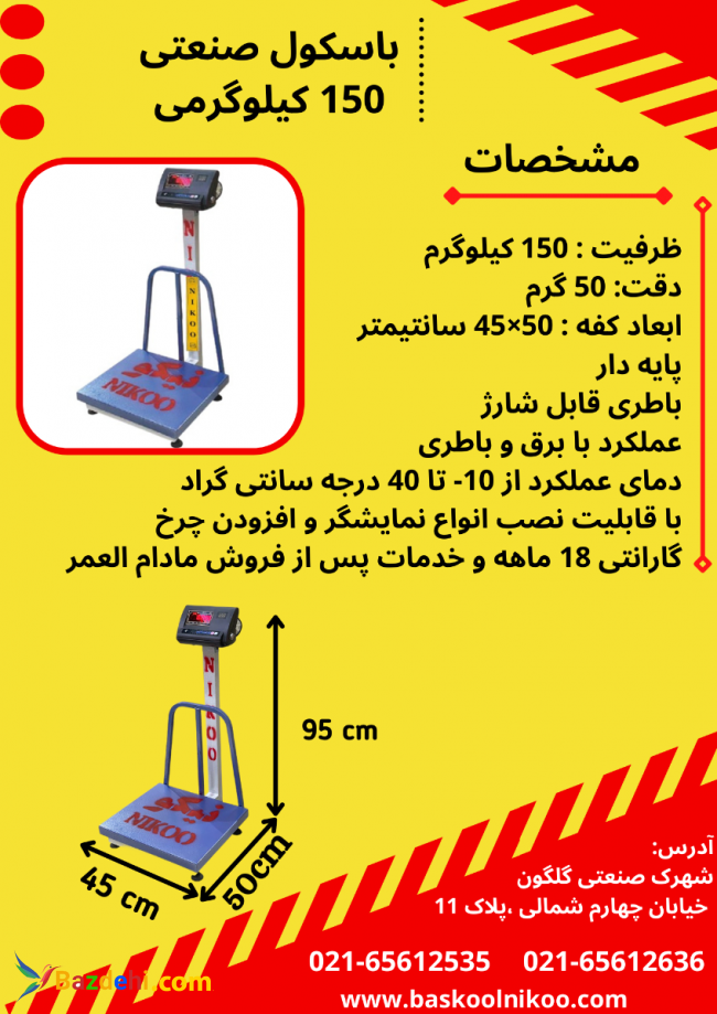 باسکول 100 کیلوی نیکو حداکثر وزن 150 کیلوگرم حداقل وزن 2/5 کیلوگرم دقت 20 -50 -100 گرم نمایشگرLed/Lcd بدون نرده پایه دار برق شهری 220ولت/60هرتز قابلیت نصب نمایشگرپرینتر دار قابلیت نصب نمایشگر بی سیم قابلیت نصب نمایشگرماشین حسابدار قابلیت نصب چرخ دمای عملکرداز _10تا 40 درجه سانتی گراد قابلیت نصب نمایشگر دوطرفه