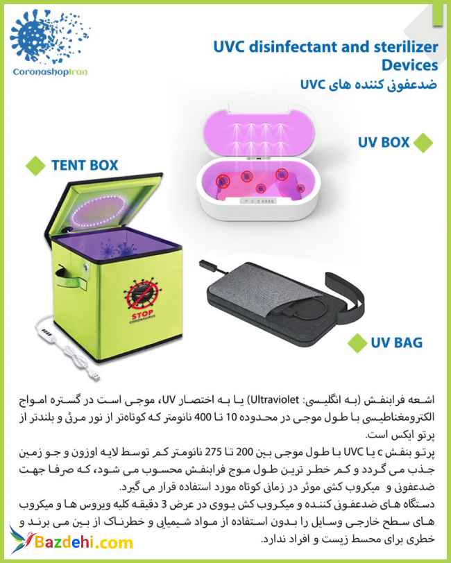 کروناشاپ ایران اقدام به واردات و فروش دستگاه های ضدعفونی کننده و میکروب کش به وسیله اشعه یووی نموده است . مناسب وسایلی که قادر به پاشیدن مواد ضدعفونی کننده به آنها نیستیم و یا قصد حفاظت از محیط زیست و خودمان را در مقابل مواد شیمیایی داریم . مناسب استفاده همه اعضای خانواده در ادارات ، منازل مسکونی ، اتاق کودک دستگاه ضدعفونی کننده و تصفیه کننده هوا با بهره گیری از گاز امن اوزون برای حذف بوی بد یخچال و سرویس بهداشتی و داخل اتاق ها و اتومبیل قابل استفاده است لینک سایت