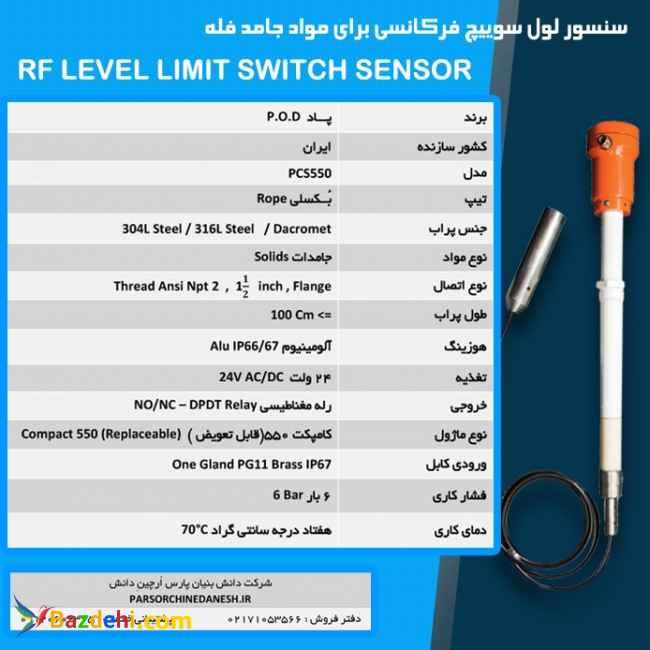 لول سوئیچ خازنی میله ای و طنابی لول سوئیچ خازنی پاد PCS محصول ایرانی با کیفیت و دارای گارانتی در مدل های مخصوص مایعات و جامدات قابل استفاده در مخازن مایعات یا سبلوهای غلات، شن و ماسه با دمای پایین و بالا تا 300 درجه بسته به مدل قابل استفاده می باشد. مدل سوئیچ خازنی میله ای و شمشیری پاد PCS با ارتفاع مورد نظر شما قابل طراحی و تولید می باشد.جهت مشاهده محصولات ، بررسی و جزئیات بیشتر به سایت " WWW.PARSORCHINEDANESH.IR " مراجعه نمائید. همچنبن فروش و قیمت با شماره های (09120602365 و 02171053566) تماس حاصل فرمائید. جهت مشاوره و خرید 02171053566