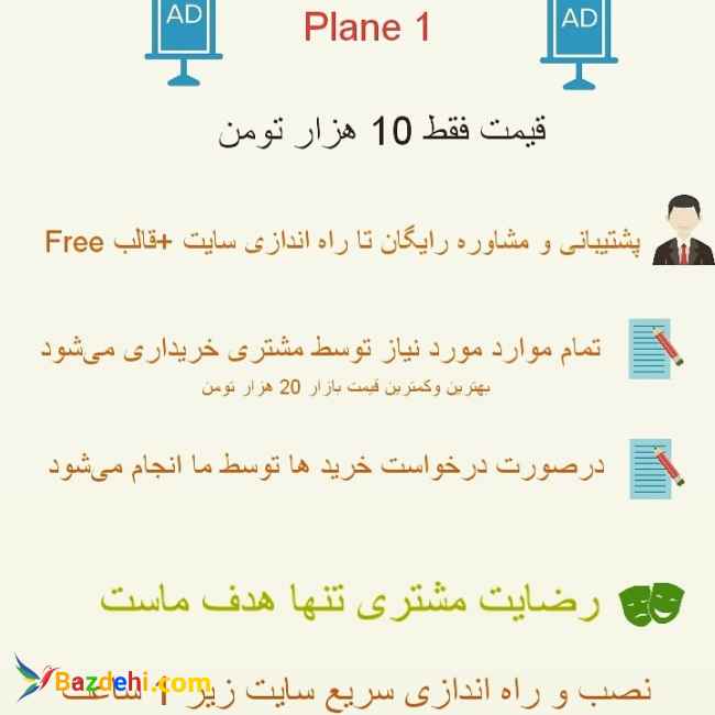 با سلام دوستان عزیز لطفا به چند نکته زیر توجه فرمایید 1- ما فقط اجرت ساختن سایت را دریافت میکنیم و تمام موارد مورد نیاز توسط خود مشتری صورت میگیره برای اعتبار کارمون و اگر خواست ما براش خرید ها رو انجام میدیم 2-با توجه به قیمت ها و نمونه پلن ها ما فقط سایت میسازیم و برای راحتی در کار مشتری براش یه قالب آماده نصب میکنیم و خودش ویرایش بکنه تا هزینه های چندصدهزار تومنی نکنه 3-تمام فرایند نصب و راه اندازی سایت زیر یک ساعت و توسط ما انجام میشه و شما سایت امادرو تحویل میگیرید کمترین و بهترین قیمت موجود برای موارد مورد نیاز سایت 20 هزار تومان میباشد سایت عالی و راحت مناسب برای فروشگاه ها و مغازه ها برای تبلیغات و خدمات رسانی