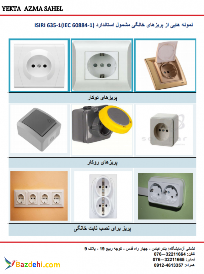 آزمایشگاه یکتا آزما ساحل به شماره گواهینامه ی hr/3275 به عنوان آزمایشگاه همکار اداره کل استاندارد استان هرمزگان که سیستم مدیریت کیفیت خود رابر مبنای استاندارد ISO/IEC17025 طراحی نموده ، و همچنین سازنده تجهیزات آزمایشگاهی می باشد آمادگی ارائه خدمات آزمایشگاهی تست و آزمون و تعمیر قطعات به شرح ذیل را به آن اداره محترم دارد : 1 – کلیدهای خودکار ( مینیاتوری ها ) ISIRI 2611 IEC60898-1 2 – کلیدهای اتوماتیک4835-2 IEC 60947-2 ISIRI 3 – کلیدهای برقی دستگاهی 3796-1 IEC 61058-1 ISIRI 4 – کلیدها و میکروسوئیچ ها 4835-5-1 IEC 60947-5-1 ISIRI 5 – کلیدهای خانگی462 IEC 60669-1 ISIRI 6 – پریزهای خانگی635-1 IEC 60884-1 ISIRI 7 – دوشاخه و پریزها و محافظ های خانگی 635-1 IEC 60884-1 ISIRI 8 - ترمینال ها 4295-1 IEC 60998-1 ISIRI