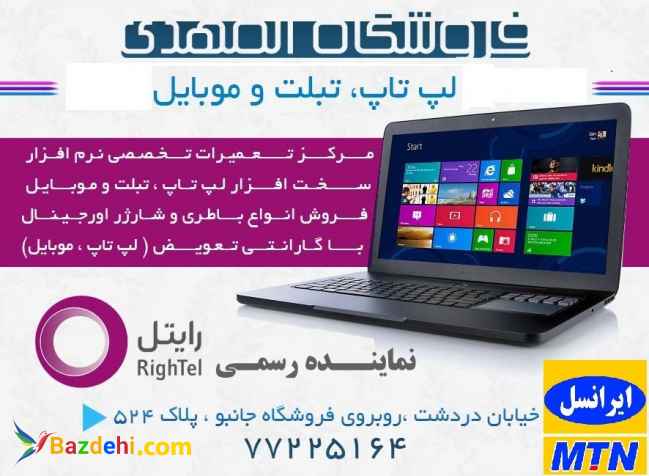 نمایندگی رسمی ایرانسل و رایتل وهمراه اول تعمیرات تخصصی تبلت و لپ تاپ و موبایل نرم افزار و سخت افزار تهیه و توزیع کلیه لوازم جانبی(موبایل و کامپیوتر) با گارانتی تهیه و توزیع انواع نرم افزارهای تخصصی با 20% تخفیف آدرس : اتوبان رسالت – دردشت – پلاک524 تلفن : 77225164 -09191062794 @allmahdii کانال تلگرامی فروشگاه المهدی Notebook.mobile.dardashtاینستاگرام