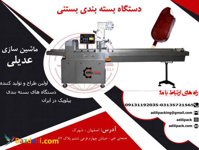 دستگاه بسته بندی بستنی چوبی ، با بهترین و بی نظیرترین کیفیت بسته بندی و نازل ترین قیمت ارائه شده در کارخانجات معتبر داخلی اعم از پریشاد ، پام ، رامک ، مهر ، رعنا و ... دستگاه ها دارای گارانتی و خدمات پس از فروش به صورت مادام العمر و نصب و راه اندازی و آموزش رایگان می باشد. ماشین سازی عدیلی اولین طراح و سازنده ی دستگاه های بسته بندی پیلو پک در ایران جهت ارتباط با ما و مشاوره خرید تماس بگیرید : 03135723293 _ 09131192035 آدرس وب سایت :www.adilipack.com اینستاگرام: adilipack تلگرام:adilipack