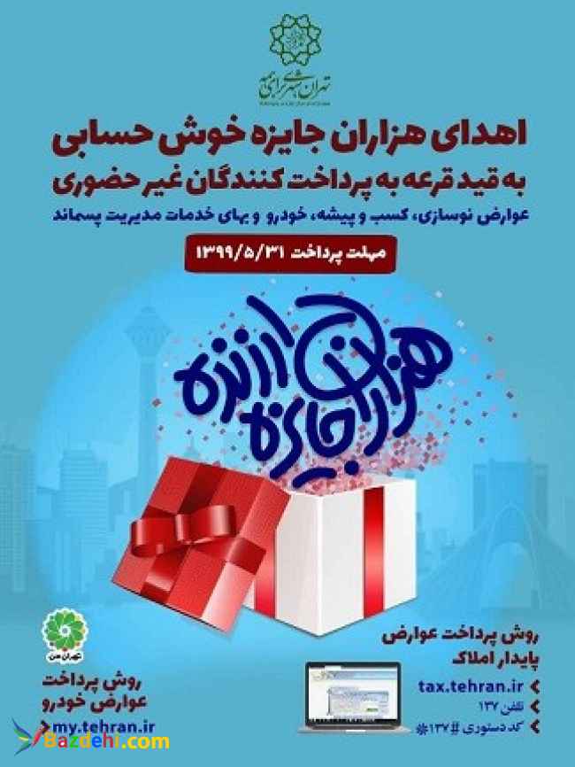 قابل توجه کسبه و تجار و شهروندان محترم تهرانی: در صورت پرداخت عوارض کسب و پیشه خود تا پایان مردادماه۹۹ از ۱۸ درصد جایزه خوش حسابی و ۱۰درصد بخشودگی کلیه معوقات بهره مند می شوید. تا پایان مرداد ماه99 "جایزه خوش حسابی و تخفیف و بخشودگی گسترده شهرداری تهران تا ۳۱مردادماه برای عوارض کسب و پیشه و بهای پسماند" مهلت پرداخت عوارض کسب و پیشه برای بهره مندی از جوایز خوش حسابی فقط تا تاریخ 31 مردادماه99 می باشد. 09125101809 021۲۲۵۸۶۰۶۱ لینک سایت:tax.tehran.ir اپلیکیشن پرداخت عوارض اتوبان اپلیکیشن پرداخت عوارض خودرو اداره مرکزی عوارض خودروی شهرداری تهران ایستگاه پلیس راهنماییورانندگی آخرین مهلت پرداخت عوارض خودرو بخشنامه تسویه زودتر از موعد تسهیلات بخشودگی جرایم عوارض خودرو بخشودگی جرایم عوارض خودرو تهران پرداخت عوارض خودرو تهران پرداخت عوارض سالیانه خودرو پرداخت عوارض کسب و پیشه بر عهده کیست تخفیف جریمه دیرکرد عوارض معوقه خودرو تخفیف عوارض خودرو تخفیف عوارض شهرداری تهران تخفیف عوارض شهرداری خودرو خدمات خبررسانی دفتر مدیریت شهری سامانه پرداخت عوارض خودرو شهردارى منطقه ٦ عدم پرداخت عوارض کسب و پیشه عوارض سالیانه شهرداری عوارض شهرداری مغازه به عهده کیست عوارض کسب و پیشه به چه کسانی تعلق میگیرد عوارض کسب و پیشه دفاتر بیمه مبلغ عوارض کسب و پیشه محاسبه آنلاین عوارض خودرو مهلت پرداخت عوارض خودرو شهرداری مهلت پرداخت عوارض سالیانه خودرو مهلت پرداخت عوارض شهرداری مهلت پرداخت عوارض نوسازی نحوه محاسبه عوارض کسب و پیشه