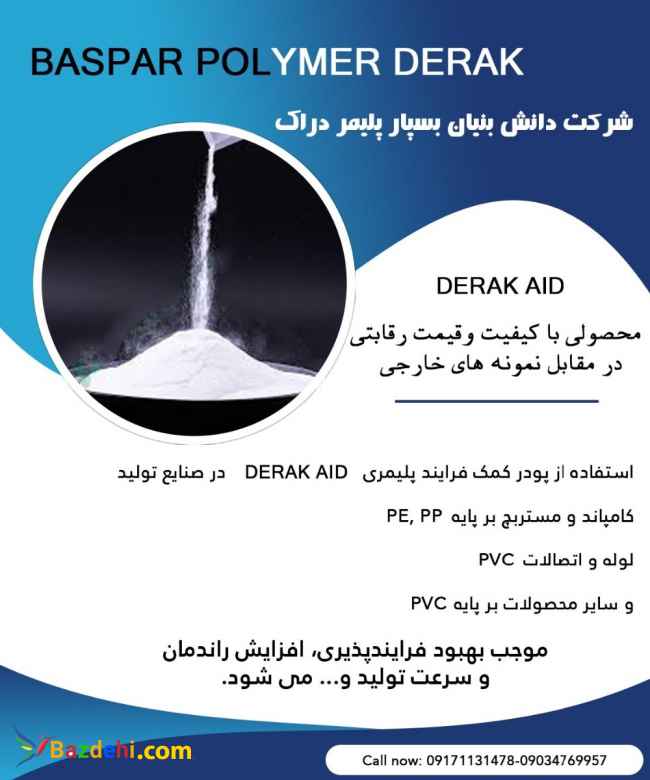 کمک فرایند پلیمری DERAK AID محصولی از شرکت دانش بنیان بسپار پلیمر دراک می باشد که به منظور تسهیل فرایند تولید و بهبود برخی از خواص نهایی و رفع بسیاری از نواقص تولید محصولات پلیمری (مخصوصا در فرایند اکستروژن) در درصدهای خیلی کم به آن ها افزوده می شود. مزایای استفاده از کمک فرایند DERAK AID: -حذف پدیده شکست مذاب -حذف پدیده دای بیلدآپ (سوختگی سر قالب) -یکنواختی جریان مذاب و محصول -رفع نواقص سطحی (پوسته پوسته شدن، زبری و...) -کاهش مصرف انرژی دستگاه تولید و در نهایت کاهش قیمت تمام شده -بهبود خواص سطحی (شفافیت و براقیت، چاپ پذیری و دوخت پذیری) -امکان کاهش دمای فرایند و فشار وارده به ماشین آلات -کمک به پخش بهتر رنگدانه ها و مواد معدنی در ماتریس پلیمری کمک فرایند DERAK AID به شکل پودر و مستربچ و بر پایه پلی اتیلن، پلی پروپیلن و PVC در گریدهای مختلف قابل عرضه می باشد.