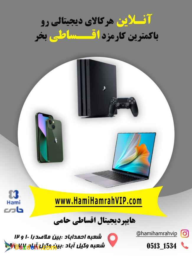فروش قسطی انواع کالای دیجیتال به صورت حضوری و غیرحضوری (از وبسایت: https://hamihamrahvip.ir) در فروشگاه اقساطی حامی مشهد خریدی راحت و مطمئن و مقرون ب صرفه داشته باشید با فروشگاه بزرگ حامی اقساط تمامی شرایط به دلخواه شما عزیزان می باشد بدون پیش پرداخت باچک ارسال رایگان به سراسر مشهد خرید غیر حضوری از طریق سایت فروشگاه موبايل-لپ تاپ-تلوزیون-PS4-PS5-XBOX فروشگاه حامي 09381151700 05131534 خرید غیر حضوری در وبسایت: https://hamihamrahvip.ir اینستاگرام: hamihamrahvip تمام کالاهای دیجیتال مورد نیازتو اینجا میتونی پیدا کنی اونم اقساطی فروشگاه حامی عرضه انواع گوشی های آیفون،سامسونگ،شیائومی(آکبند و کار کرده) کنسول های بازی xbox-ps4-ps5(آکبند و کار کرده) تلوزیون(STAR SAT) لپ تاپ (تمامی برند ها-آکبند و کارکرده) اقساط دلخواه شما با کمترین کارمزد بدون نیاز به ضامن تنها کافیست چک بانکی داشته باشید *گوشی موبایل کارکرده خود را با گوشی نو معاوضه کنید درباره مـا ??? بیش از 20 سال سابقه در صنعت تلفن همراه ??? فروش به صورت حضوری و غیر حضوری ??? ارسال به سراسر ایران ??? اقساط بلند مدت و کوتاه مدت ??? عرضه تمامی برند های اصلی ایسوس - اچ پی- لنوو-اپل-و.. ??? نحوه تسویه به دلخواه شما مشتری محترم ??? شرایط ویژه جهت کارمندان محترم دولت - اتش نشانی - دادگستری - آموزش و پرورش ??? بیمه یکسـاله موبایل و لپ تاپ و اپل واچتون بصورت اقسـاطی. با ما تماس بگیرید فروشگاه:05131534 نشانی:بین وکیل آباد 77 و 79 مسیر کندرو هایپر دیجیتال اقساطی حامی شعبه احمد آباد :بین ملاصدرا 10 و 12 فروشگاه حامی خرید غیر حضوری در وبسایت: https://hamihamrahvip.ir اینستاگرام ما: hamihamrahvip@ با مدیریت جناب آقای تقی زاده