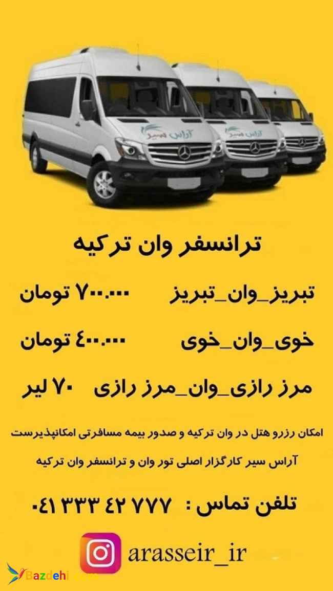 ترنسفر رفت و برگشت تبریز وان تبریز با ون ترک از مرز رازی همه روزه حرکت 7 صبح از تبریز و 12 ظهر به وقت ترکیه از وان آراس سیر تبریز مجری اصلی تورهای وان نمایندگی رزرواسیون تورهای وان و اولین مجری تور وان برای اطلاعات بیشتر با شماره تماس بگیرید