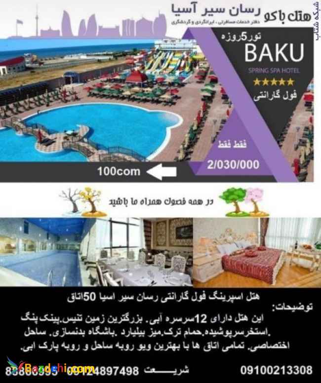 تور باکو شامل ۳ شب و ۴ روز اقامت استخر سونا جکوزی صد قدمی ساحل دریا گشت شهری کامل موسیقی زنده ویزا اتوبوس وی آی پی ۲۵ صندلی بیمه مسافرتی سامان لیدر تور از مبدا پیش فروش هتل های اواخر تابستان سراسر دنیا تورهای داخلی : مشهد ، کیش و قشم تورهای خارجی : استانبول ، آنتالیا ، وان ، باکو ، ترابزن ، ارمنستان ، گرجستان ، دبی ، تایلند ، چین و هند تور باکو زمینی ویژه کریسمس یا ژانویه و نوروز ۹۹ ۴ شب و ۵ روز ، هتل ها فول گارانتی خدمات تور : رفت و برگشت با اتوبوس توریستی ۲۵ نفره ، ویزای الکترونیکی توریستی جمهوری آذربایجان ، تعداد شب های اقامت در هتل و پذیرایی صبحانه ، یک گشت تمام روز شهری و مراکز تاریخی و مراکز خرید ، بیمه حوادث مسافربری و تور لیدر هتل اسپرینگ فول گارانتی رسان سیر اسیا ۵۰ اتاق این هتل دارای ۱۲ سرسره ابی ، بزرگترین زمین تنیس ، پینگ پنگ ، استخر سر پوشیده ، حمام ترک ، میز بیلیارد ، باشگاه بدن سازی ، ساحل اختصاصی ، تمامی اتاق ها با بهترین ویو رو به ساحل و رو به پارک آبی همراه با موسیقی زنده و کنسرت با هتل های ۵ستاره و ۴ستاره ایدی تلگرام : https://t.me/rasanseirasiya اینستاگرام : https://instagram.com/rasanseir?igshid=205ukkh0k7wa ایمیل : این آدرس ایمیل توسط spambots حفاظت می شود. برای دیدن شما نیاز به جاوا اسکریپت دارید تلفن های تماس : 09124897498 ۰۹۱۲۸۳۳۲۱۱۸ 88866995 88312224_5 آدرس : هفت تیر ، خیابان کریم خان ، رو به رو ی داروخانه ۱۳ ابان ، مجتمع کریم خان طبقه اول ، واحد A12 **************** تور باکو تور باکو ارزان خدمات تور سفر باکو تور زمینی ارزان اقامت هتل نرخ نوروزی هتل تور زمینی باکو تخفیف های هتل و تور تخفیف ویژه تور تور خارجی تور داخلی تور مسافرتی تور مسافرتی داخلی تور مسافرتی خارجی تور خارجی و داخلی تور استانبول تور آنتالیا تور وان تور باکو تور ارمنستان تور گرجستان تور دبی تور تایلند تور چین تور هند تور کیش تور قشم تور مشهد تور باکو زمینی ویژه تور مسافرتی تور لحظه آخری تور ارزان تور نوروز تور تابستان تورهای ارزان تورهای مسافرتی داخلی تورهای مسافرتی خارجی تور گردشگری