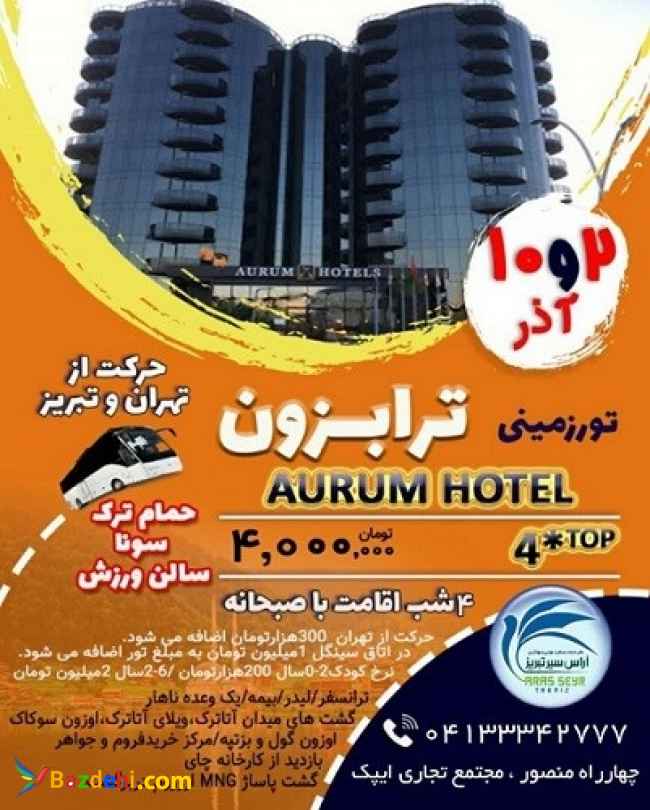 تور ترابزون زمینی از تهران و تبریز حرکت 2 و 10 آذر 4 شب اقامت با صبحانه در هتل 4 ستاره دارای حمام ترک ، سونا و سالن ورزشی خدمات تور: ترانسفر، لیدر، یک وعده ناهار گشت های میدان آتاترک، ویلای آتاترک، اوزون سوکاک، اوزون گال و بزتپه، مرکز خرید فروم و جواهر، بازدید از کارخانه چای، گشت پاساژ MNG ارزروم در برگشت حرکت از تهران 4 میلیون و سیصد حرکت از تبریز 4 میلیون کودک 0-2 سال 200 هزار تومان کودک 2-6 سال 2 میلیون تومان آژانس آراس سیر تبریز دارای سابقه طولانی در اجرای تورهای ترکیه برای اطلاعات بیشتر تماس بگیرید: 04133342777 04133251388 09146176089 09141096089
