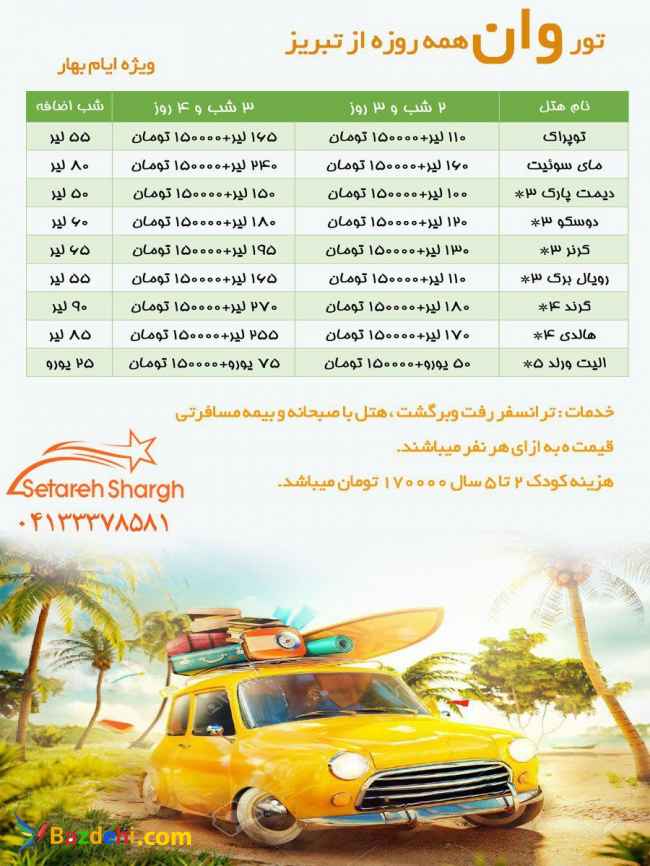 سایر قیمت ها و برای مدت زمان های بیشتر برای تور زمینی وان ترکیه از تبریز را با کلیک بر روی عکس مشاهده نمایید.