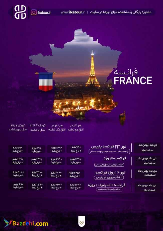 تورهای لوکس اروپا انفرادی و گروهی تور FIT فرانسه شروع نرخ از: 990 یورو + نرخ بلیط هواپیما هر هفته ورود به سفارت فرانسه مدارک لازم: اصل و ترجمه شناسنامه، اصل مدارک شغلی به همراه ترجمه + گذرنامه با حداقل 7 ماه اعتبار از تاریخ سفر بدون نیاز به سند ملکی، بدون نیاز به سوابق بیمه، بدون نیاز به سوابق مالیاتی قابلیت اخذ ویزا تا 12 روز و استفاده از کل مدت ویزا به درخواست مسافر