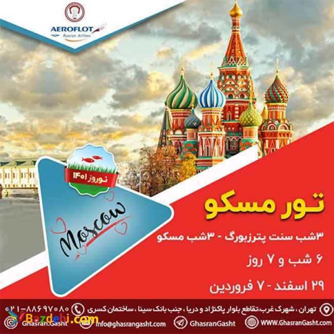 از تاریخ : 29 اسفند الی 7 فروردین 1401 به مدت 6 الی 7 روز شهرهای: سنت پترزبورگ و مسکو 3شب سنت پترزبورگ-3شب مسکو خدمات: بلیط رفت و برگشت و پرواز داخلی بین دوشهر با هواپیمایی ملی روسیه (ایرفلوت) ویزا 6 شب اقامت با صبحانه در هتل 2 گشت شهری به همراه یک نهار در مسکو و یک گشت شهری با نهار در سنت پترزبورگ لیدر فارسی زبان ترانسفر فرودگاهی بیمه مسافرتی