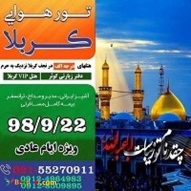 تور هوایی(7شب 8روز) دفتر زیارتی کوثر اقامتی خاطر انگیز در هتل vip در کربلا (5شب) هتل درجه الف در نجف اشرف(2شب) ترانسفر فرودگاهی گشت زیارتهای دوره صبحانه،نهار،شام همراه با سرو میوه عوارض خروج از کشور به عهده مسافر میباشد عوارض ورودی نجف به عهده مسافر میباشد استفاده از کادری مجرب در عراق همراهی مدیران و مداحان برجسته (این مجموعه کفیت را فدای کمیت نمیکند) اجرایی متفاوت و بیاد ماندنی 02155270911 02155275370. 09124964983 09128509895