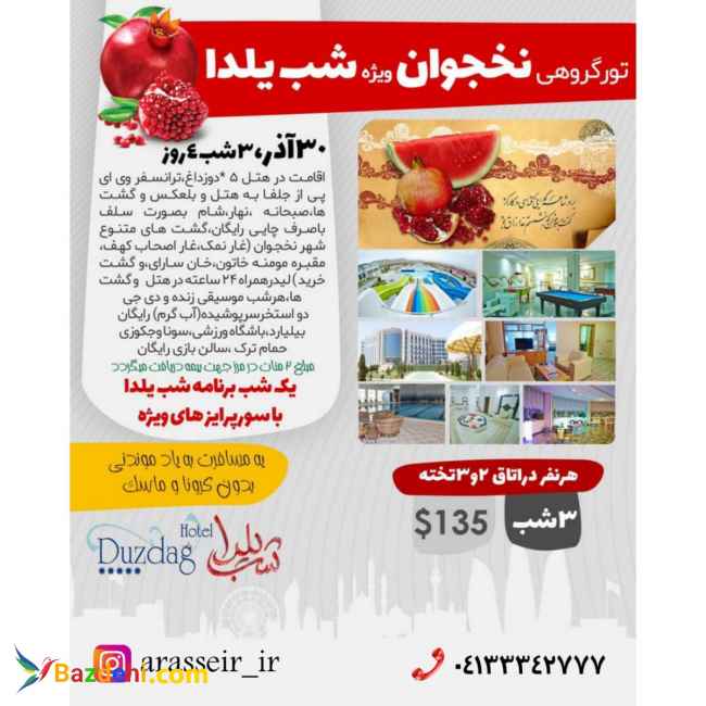 تور گروهی نخجوان ویژه شب یلدا حرکت 30 آذر مدت اقامت: 3 شب و 4 روز اقامت در هتل 5 ستاره دوزداغ، ترانسفر وی ای پی از جلفا به هتل و بلعکس به همراه گشت ها(گشت شهری رایگان شامل گشت غار اصحاب کهف، مقبره مومنه خاتون، غار نمک، سرای خان و گشت خرید) صبحانه ، ناهار و شام به صورت سلف با صرف چای رایگان، لیدر 24 ساعته در هتل و گشت ها هر شب موسیقی زنده و دی جی دو استخر سرپوشیده ( آب گرم) رایگان بیلیارد، باشگاه ورزشی، سونا و جکوزی، حمام ترک و سالن بازی رایگان یک شب برنامه شب یلدا با سوپرایزهای ویژه برای اطلاعات بیشتر تماس بگیرید: 04133342777 04133251388 09146176089 09141096089
