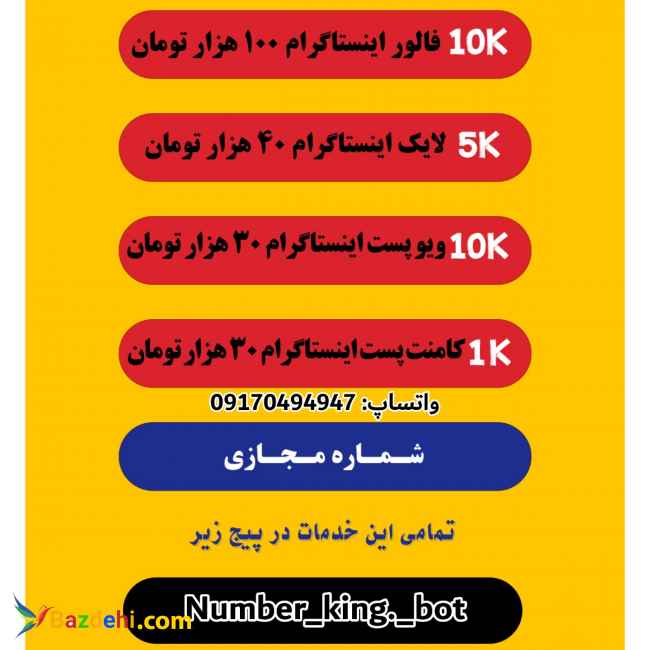 ⭕فالور۱۰ کا ۱۰۰ هزار تومان⭕ ⭕لایک۵کا ۴۰ هزار تومان⭕ ⭕کامنت۱کا ۳۰ هزار تومان⭕ ⭕ویو۱۰کا ۳۰ هزار تومان⭕ دارای نماد اعتماد الکترونیکی ✅ ?قدیمی ترین فروشگاه خدمات مجازی ? لینک فروشگاه نامبر کینگ https://www.instagram.com/Number_king._bot لینک گروه واتساپ https://chat.whatsapp.com/KjCLgFz4iAcEecQp8nHs6v ♥️ تیم خدماتی نامبر کینگ ♠️