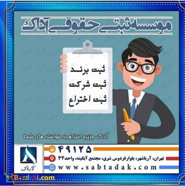 ارائه کلیهی خدمات ثبتی ثبت انواع شرکت / ثبت انواع تغییرات / اخذ کارت بازرگانی / ثبت برند / اخذ جواز تأسیس / ثبت طرح صنعتی کمترین هزینه سریعترین زمان مشاوره رایگان شماره ثابت : 49125 / 44034137 / 44031160 ایمیل : این آدرس ایمیل توسط spambots حفاظت می شود. برای دیدن شما نیاز به جاوا اسکریپت دارید اینستاگرام @sabtadak