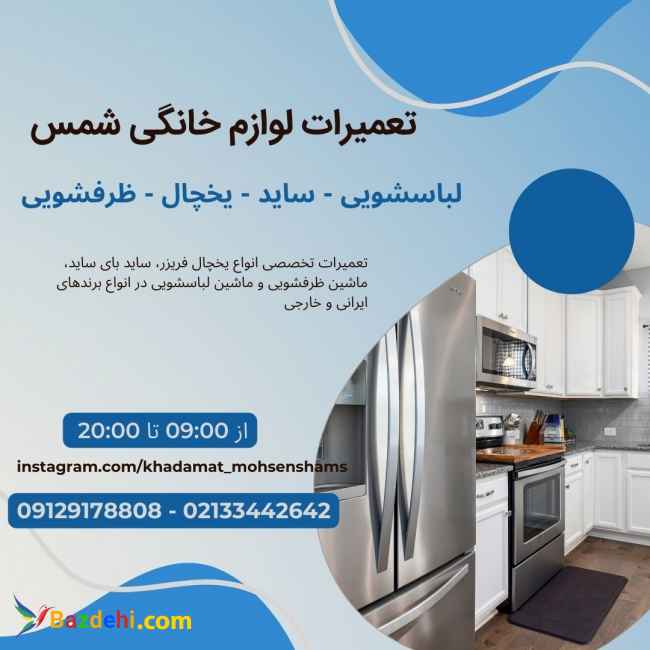 انجام خدمات تعمیرات ساید، یخچال، لباسشویی، ظرفشویی در انواع برندهای ایرانی و خارجی تعمیرات ساید شامل تعمیر قطعات ساید، عیب یابی یخچال، تعمیر یخ ساز، تعمیر و تعویض فن، اصلاح تنظیمات یخچال، تعمیرات تخصصی برد و تامیر ساید، سرویس ساید در حضور مشتری درب منزل در تهران 09129178808 02133442642 02133442644 02133443770