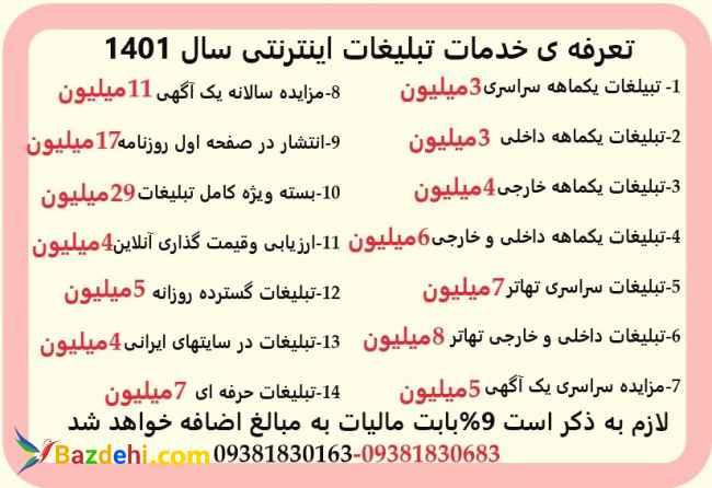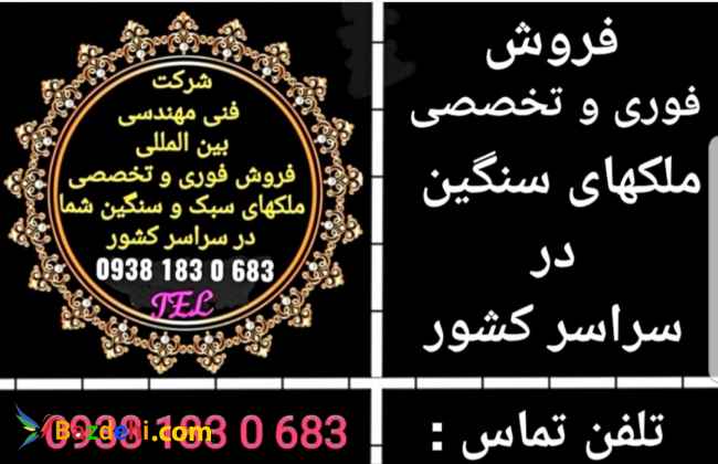 فروش فوری و تخصصی ملکهای سنگین شما در سراسر کشور ------------------------------------------------------- شرکت فنی مهندسی ------------------------------------------------------ هلدینگ بزرگ بین المللی ------------------------------------------------------- ارزیابی و قیمت گذاری آنلاین ملکهای سبک و سنگین شما در سراسر کشور ------------------------------------------------------- معرفی خریدار داخلی و خارجی برای ملکهای شما ------------------------------------------------------- فروش نقدی یا تهاتر ملک ------------------------------------------------------- قبول سفارش مزایده برای ملکهای شما ------------------------------------------------------- تبلیغات گسترده آنلاین داخلی و خارجی برای ملک های شما ------------------------------------------------------- فروش انواع ملک های شما از قبیل: کارخانجات ، هتل ، رستوران ، پمپ بنزین ، مجتمع های مسکونی اداری تجاری ، زمین های هکتاری ، ویلا وغیره..... ------------------------------------------------------- تعرفه خدمات تبلیغات اینترنتی سال 1401 ------------------------------------------------------- 1-تبلیغات یک ماهه سراسری 3 میلیون تومان ------------------------------------------------------- 2- تبلیغات یک ماهه داخلی 3 میلیون تومان ------------------------------------------------------- 3-تبلیغات یک ماهه خارجی 4 میلیون تومان ------------------------------------------------------- 4- تبلیغات یکماهه داخلی وخارجی 6 میلیون تومان ------------------------------------------------------- 5-تبلیغات سراسری تهاتر 7 میلیون تومان ------------------------------------------------------- 6-تبلیغات داخلی و خارجی تهاتر 8 میلیون تومان ------------------------------------------------------- 7-مزایده سراسری یک آگهی 5 میلیون تومان ------------------------------------------------------- 8-مزایده سالانه یک اگهی 11میلیون تومان ------------------------------------------------------- 9- انتشار اگهی ویژه و برتر درصفحه اول روزنامه سراسری رسمی کشوری 17 میلیون تومان ------------------------------------------------------- 10- بسته ویژه کامل تبلیغات 29 میلیون تومان ------------------------------------------------------- 11-ارزیابی و قیمت گذاری آنلاین ملک 4 میلیون تومان ------------------------------------------------------- 12- تبلیغات گسترده روزانه 5 میلیون تومان ------------------------------------------------------- 13- تبلیغات مداوم در سایت های ایرانی 4 میلیون تومان ------------------------------------------------------- 14 تبلیغات حرفه ای 7 میلیون تومان ------------------------------------------------------- لازم به ذکر است مبلغ 9 درصد بابت مالیات به هر تعرفه اضافه خواهد شد. ------------------------------------------------------- شرکت فنی مهندسی هلدینگ بزرگ بین المللی -------------------------------------------------------