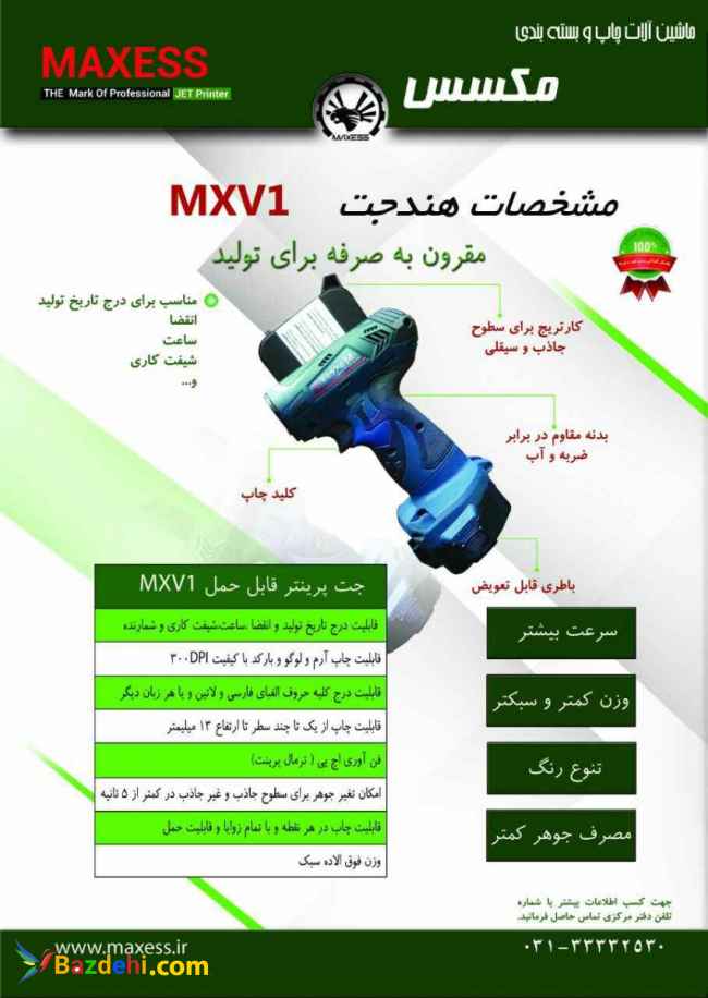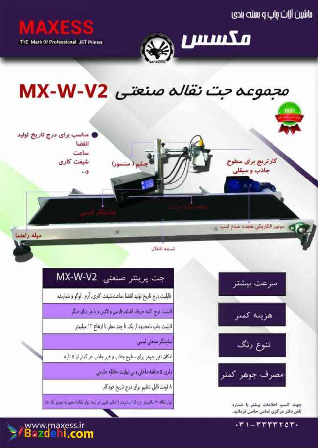شرکت دانش بنیان مکسس تولید کننده انواع جت پرینترهای صنعتی و دستی( پرتابل) امکانات ومزایای دستگاه صنعتی ۱_ به روزترین تکنولوژی چاپ در ساخت دستگاه ۲_ قابلیت چاپ روی سطوح مختلف( شیشه ،پلاستیک،فلزات و...) ۳_ قابلیت استفاده در صنایع مختلف( بهداشتی،آرایشی،خوراکی و...) ۴_قابلیت چاپ( حروف،عدد،لوگو،بارکدو) ۵_ قابلیت چاپ پنج خط به بالاوقابلیت چاپ به صورت درشت نگار ۶_ ارتفاع چاپ۱۳ میلیمتر(۱/۳ سانتیمتر) ۷_ دارای صفحه نمایش بر روی دستگاه برای تغییر اطلاعات چاپ ۹_ دارای نوار نقاله ونرم افزار فارسی ۱۰_ ساخت ایران ۱۱_ یکسال گارانتی بی قید وشرط وپنج سال خدمات پس از فروش و تیم پشتیبانی۲۴ ساعته امکانات و مزایای جت پرینتر دستی ۱ قابلیت چاپ( حروف،عدد،لوگو،بارکدو) ۲_ قابلیت چاپ بر روی سطوح مختلف ( شیشه ،پلاستیک،فلزات،چوب و...) ۳_ قابلیت حمل بسیار آسان و دارای باطری شارژی ۴_ بدون هزینه نگهداری و سرویس ۵_ دارای نرم افزار تحت ویندوز و انتقال اطلاعات از طریق بلوتوث به کامپیوتر ۶_ نرم افزار کاملا فارسی ۷_ قابلیت چاپ ۴ الی۶ خط به بالا وامکان چاپ به حالت درشت نگار ۸_ ساخت ایران .گارانتی بی قید وشرط یکساله ،پنج سال خدمات پس از فروش وپشتیبانی ۲۴ ساعته انواع جت پرینتر های : صنعتی _ دستی _ نوار نقاله دار _ تاریخ زن _ تاریخ زن تخم مرغ _ تاریخ زن دستی و صنعتی _ تاریخ زن پرتابل دار _ چاپگر _ چاپگر دستی و صنعتی شهرک علمی تحقیقاتی_ساختمان امید پلاک۱۱۶ تلفن : ۰۳۱۳۳۳۳۲۵۳۰ فاکس : ۰۳۱۳۳۳۳۲۵۳۰ همراه : ۰۹۳۸۰۹۷۶۶۰۲ ۰۹۱۳۵۴۹۱۳۱۹ ایمیل: این آدرس ایمیل توسط spambots حفاظت می شود. برای دیدن شما نیاز به جاوا اسکریپت دارید سایت: MAXESS.ir تلگرام: @maxessir